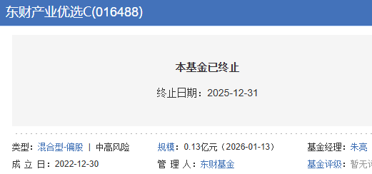 根据基金管理人于2025年12月31日发布的《关于西藏东财产业优选混合型发起式证券投资基金发生基金合同终止情形及基金财产清算的公告》,该基金基金合同生效日为2022年12月30日,基金合同生效之日起满三年后的对应日(该对应日如为非工作日,则自动顺延至下一个工作日)为2025年12月30日。截至2025年12月30日日终,该基金基金资产净值低于2亿元人民币,触发了基金合同约定的自动终止情形。基金管理人将按照基金合同的约定履行基金财产清算程序,无须召开基金份额持有人大会。