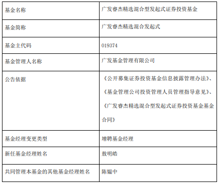 今日,广发基金公告,广发睿杰精选混合发起式增聘敖明皓。
